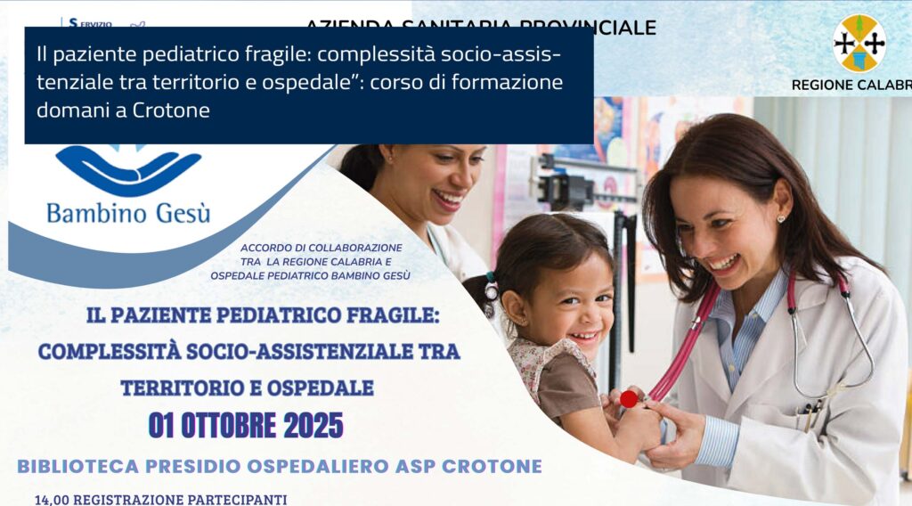 Il paziente pediatrico fragile: complessità socio-assistenziale tra territorio e ospedale”: corso di formazione domani a Crotone